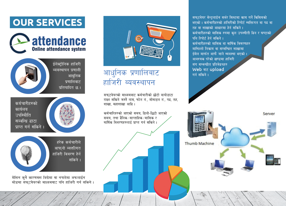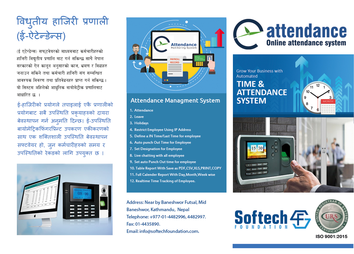 यस शन्दर्भमा विद्युतीय हाजिरी (ई एटेन्डेन्स) लागि आवस्यक ई एटेन्डेन्स रेकडिङ सिस्टम सफ्टवेयर यस संस्थाले विकास गरेको छ । सो सफ्टवेयरको माध्यमवाट कर्मचारीहरुको हाजिरी विद्युतीय प्रणालि बाट गर्न सकिन्छ साथै नेपाल सरकारको ऐन कानून अनुसारको काज, भ्रमण र विदाहरु जनाउन सकिने तथा कर्मचारी हाजिरी संग सम्वन्धित आवश्यक विवरण तथा प्रतिवेदनहरु प्राप्त गर्न सकिन्छ । यो सिस्टम अहिलेको आधुनिक वायोमेट्रीक प्रणालिबाट आधारित छ ।
