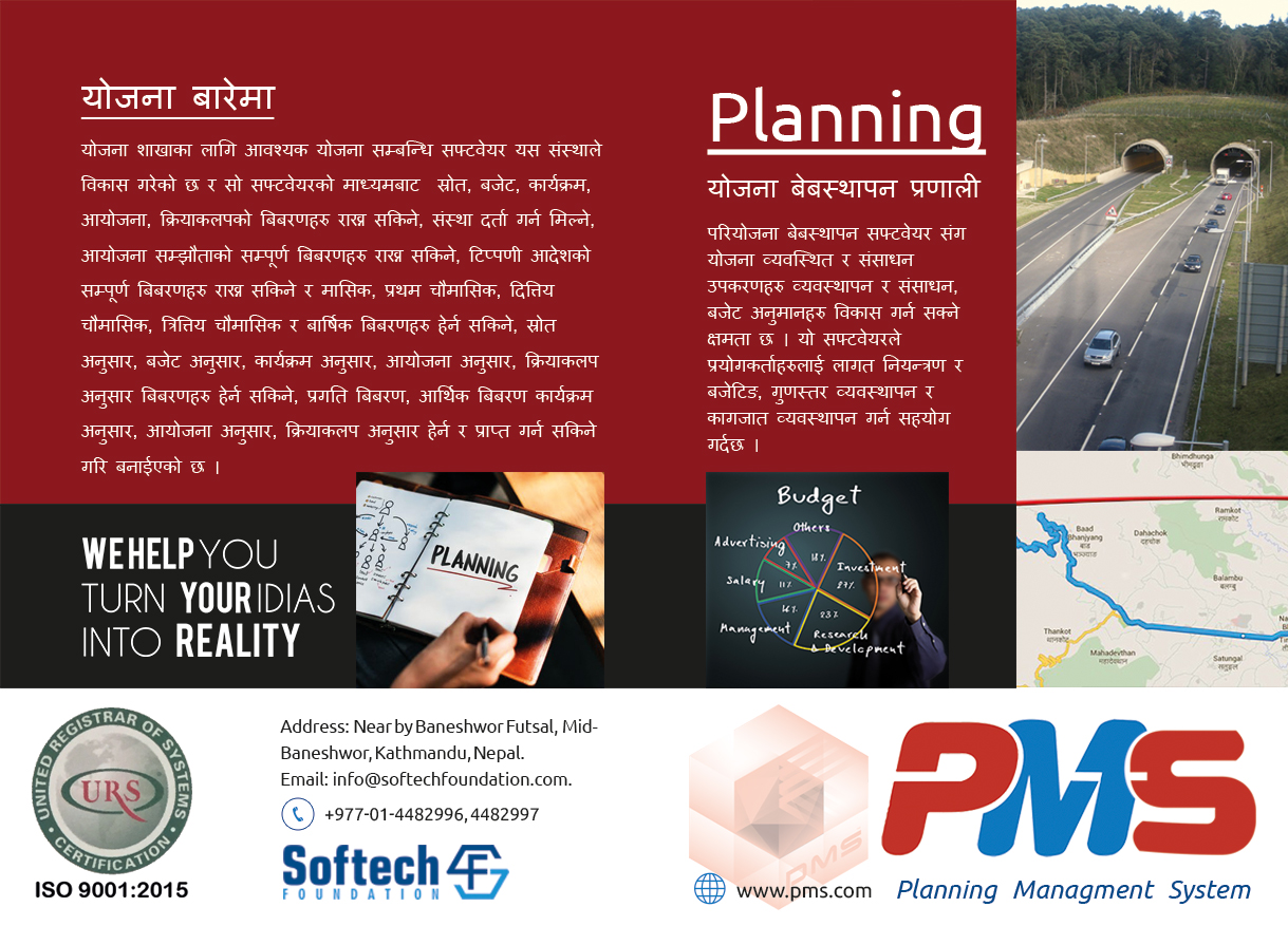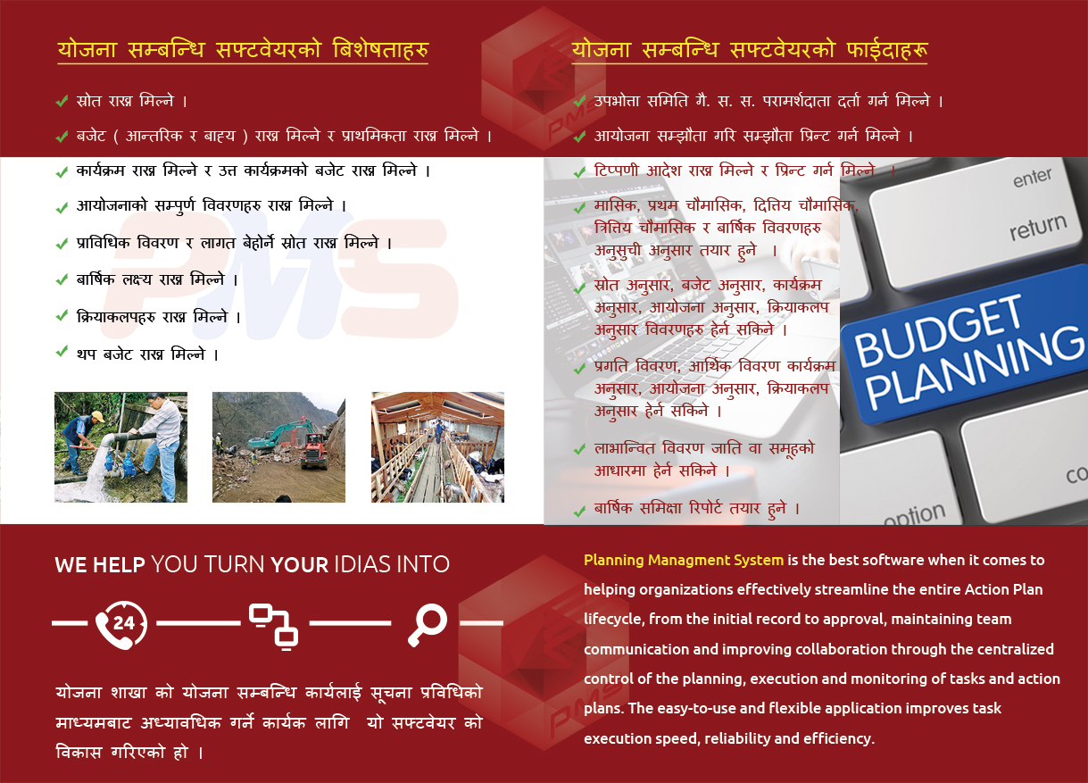 योजना शाखाका लागि आवश्यक योजना सम्बन्धि सफ्टवेयर यस संस्थाले विकास गरेको छ र सो सफ्टवेयरको माध्यमबाट स्रोत, बजेट, कार्यक्रम, आयोजना, क्रियाकलपको बिबरणहरु राख्न सकिने, संस्था दर्ता गर्न मिल्ने, आयोजना सम्झौताको सम्पूर्ण बिबरणहरु राख्न सकिने, टिप्पणी आदेशको सम्पूर्ण बिबरणहरु राख्न सकिने र मासिक, प्रथम चौमासिक, दित्तिय चौमासिक, त्रित्तिय चौमासिक र बार्षिक बिबरणहरु हेर्न सकिने, स्रोत अनुसार, बजेट अनुसार, कार्यक्रम अनुसार, आयोजना अनुसार, क्रियाकलप अनुसार बिबरणहरु हेर्न सकिने, प्रगति बिबरण, आर्थिक बिबरण कार्यक्रम अनुसार, आयोजना अनुसार, क्रियाकलप अनुसार हेर्न र प्राप्त गर्न सकिने गरि बनाईएको छ ।